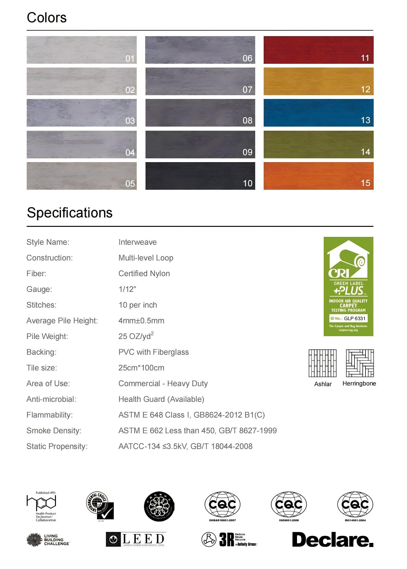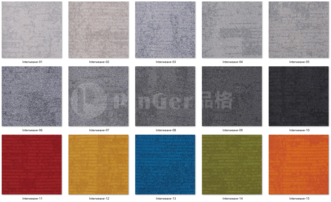 •Warna yang Kaya : Menyediakan warna mulai dari abu-abu muda (Interweave - 01) hingga hitam pekat (Interweave - 10), serta warna-warna cerah seperti merah, kuning, biru, hijau, dan oranye (Interweave - 11 hingga Interweave - 15). Dapat secara fleksibel dicocokkan dengan warna utama ruangan untuk membantu menciptakan ruang komersial yang personal dan semarak.