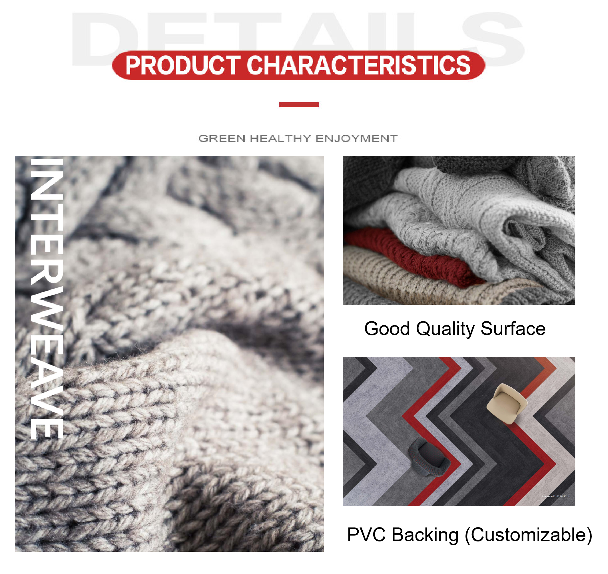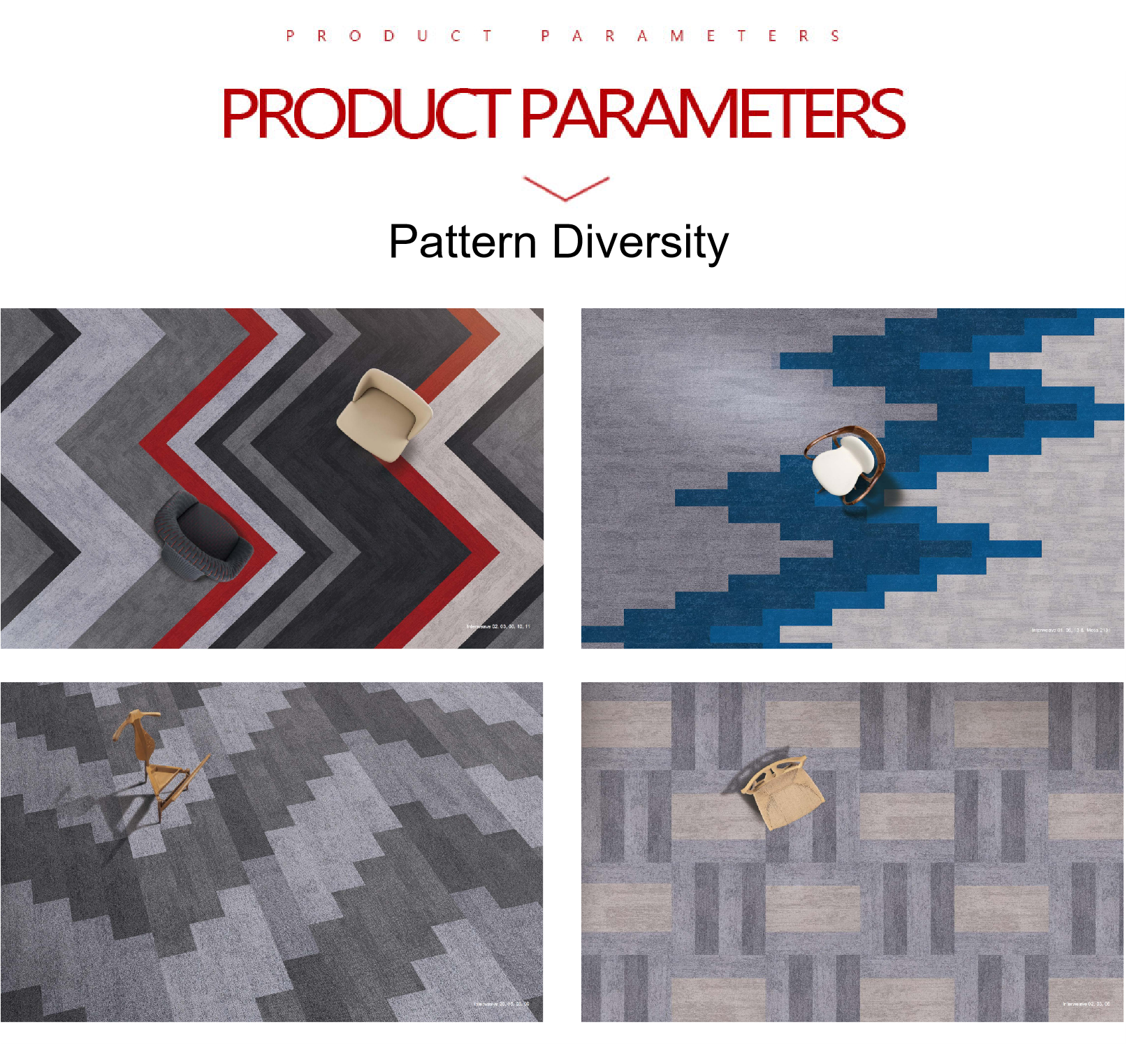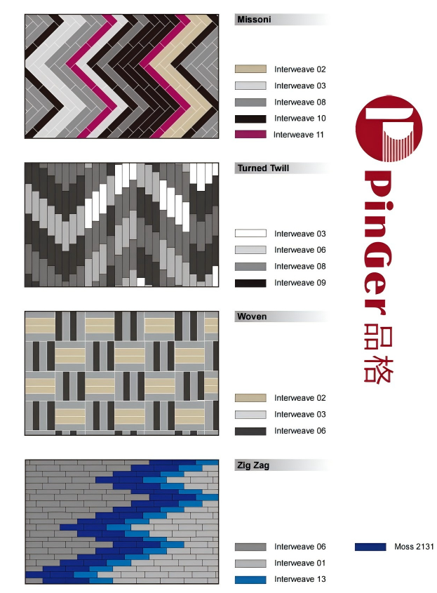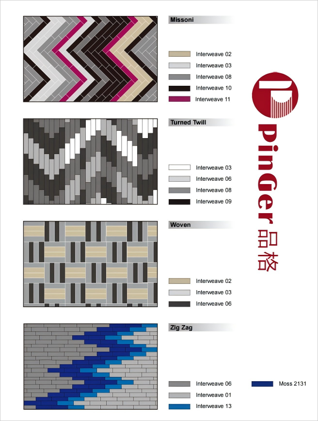 •Pola yang Beragam :Ini mencakup rangkaian pola seperti Missoni , Dibalik Kepar , Ditenun , Dan Zig-Zag Misalnya, jalinan warna Missoni seri dan garis zig-zag dinamis dari Zig-Zag Seri ini dapat memenuhi kebutuhan dekorasi berbagai gaya ruang dan menambah suasana artistik pada lingkungan komersial.